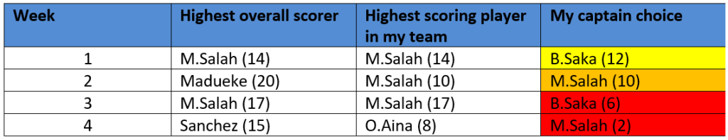 I received a total a total of 29 points. With average scores of 51 around the Globe, you can just tell I’m falling further behind. There’s a culmination of things that have gone wrong. Only 3 out of my 11 starters registered more than 2 points. Alongside my continual sorrow of missing out on Mr Haaland points, Salah (my choice of captain this week) failed me big time. Am I wrong in thinking? with Salah registering double digit returns in his past 3 games and playing at the Kop, surely, surely, surely, he will be a great choice for captain! Well. how wrong was I. A big fat 2 to go along with my shambles of a week. On the topic of captain choices let’s see how my captain choices have been so far.